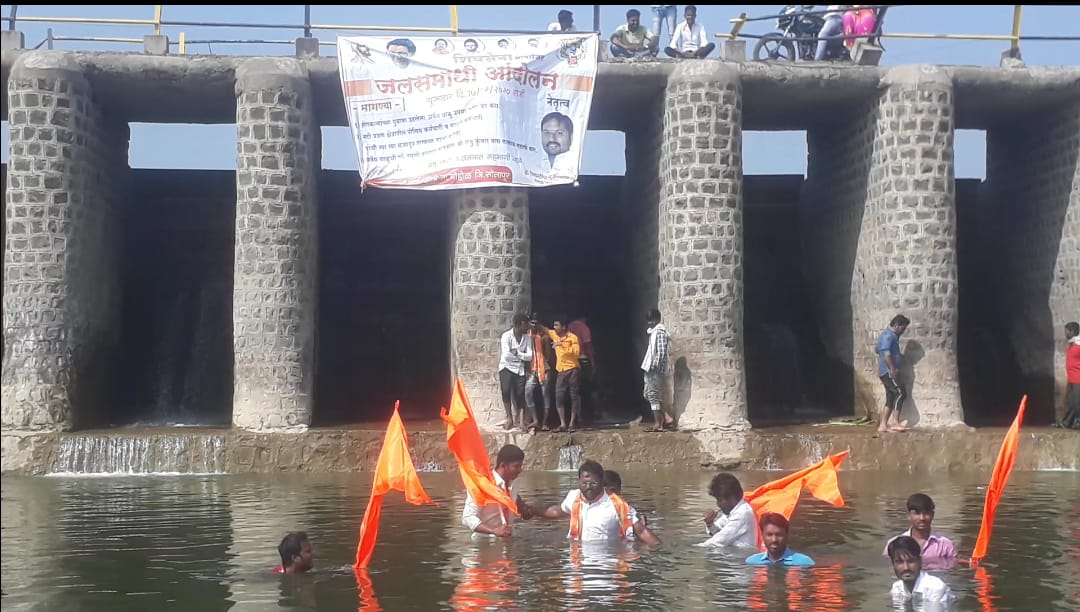 महसूल प्रशासनाच्या गैरकारभारबाबत नदी पात्रात शिवसैनिकांचे जलसमाधी आंदोलन
