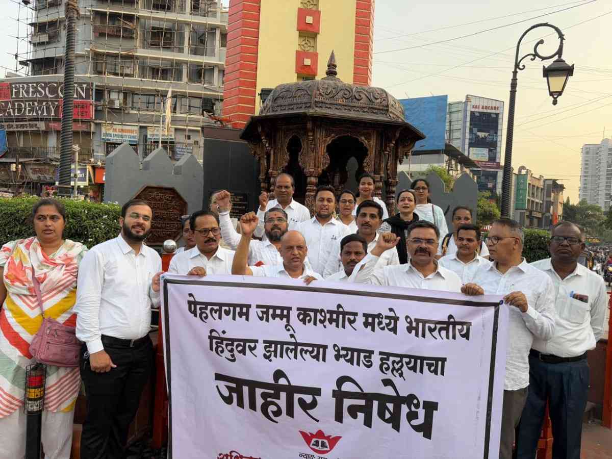 कल्याण/संघर्ष गांगुर्डे  – काश्मिरमधील पहलगाम येथे झालेल्या अतिरेक्यांच्या भ्याड हल्ल्यानंतर समाजाच्या सर्वच स्तरांतून संताप व्यक्त केला जात आहे. कल्याण तालुका अधिवक्ता परिषदेतर्फेही झालेल्या घटनेचा तीव्र शब्दांत निषेध करून त्याविरोधात निदर्शने करण्यात आली. अधिवक्ता परिषदेच्या पदाधिकारी आणि सदस्यांनी कल्याण पश्चिमेच्या छत्रपती शिवाजी महाराज चौकात एकत्र येत आपला विरोध नोंदवला.